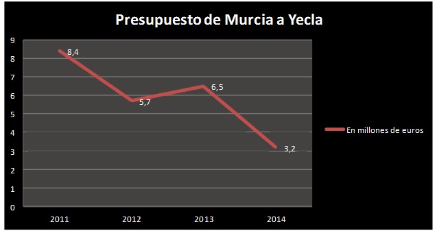 La patada va a ser memorable. Yecla se hunde y Murcia, en vez de ayudar, aprieta la soga que gira en torno al cuello de nuestro municipio. Suena duro, pero es así. Si en 2013 el presupuesto que la Comunidad Autónoma destinó a Yecla ascendía a 6,5 millones de euros, en 2014 ese montante se reduce a la mitad, pues, según los datos presentados por Murcia, Yecla solo recibirá 3,2 millones de euros en el próximo ejercicio. En concreto, un 51% menos. Los recortes se venían produciendo año tras año. En 2011, el presupuesto destinado a Yecla ascendió a 8,4 millones de euros, en 2012 se redujo a 5,7 y en 2013, aumentó hasta los 6,5 por el arreglo de los seis kilómetros de la carretera de Fuente Álamo –que ahora se vuelve a abandonar-. Sin embargo, el batacazo del próximo año no tiene precedentes. Yecla, con 3,2 millones de euros destinados desde Murcia, se queda entre los municipios más abandonados por la Región.